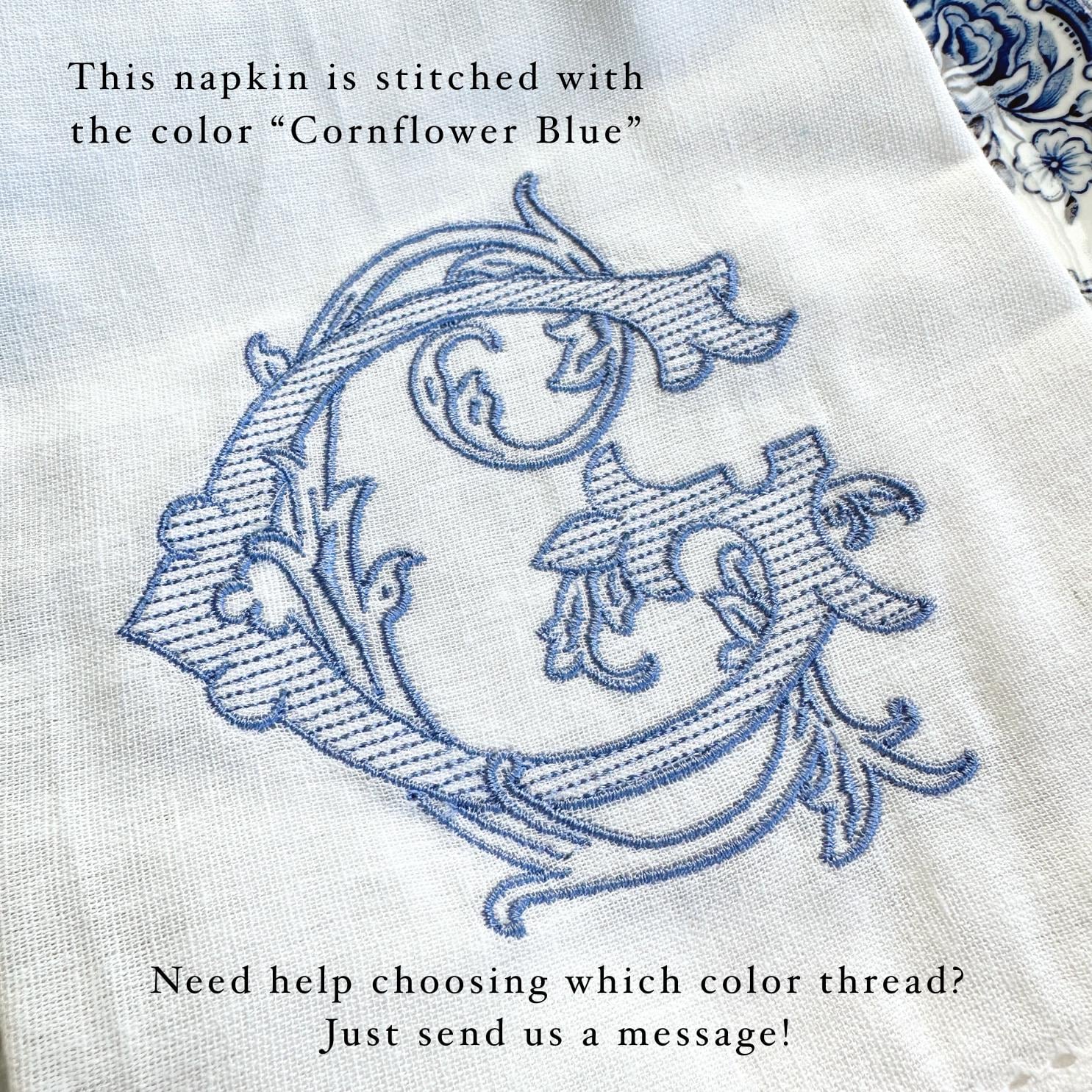 Elevate your table, kitchen, or bathroom with a personalized embroidered linen napkin, beautifully stitched with a single initial or monogram. Measuring 20x20 inches, these versatile linens can be styled as dinner napkins, tea towels, or elegant guest towels, adding a timeless and personal touch to any space.